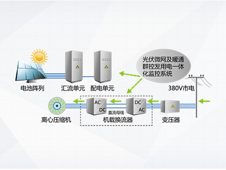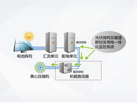 光伏發(fā)電系統(tǒng)不發(fā)電,主機(jī)向電網(wǎng)取電運(yùn)行,機(jī)組相當(dāng)于常規(guī)高效變頻離心機(jī)。 | 純光伏發(fā)電工作模式